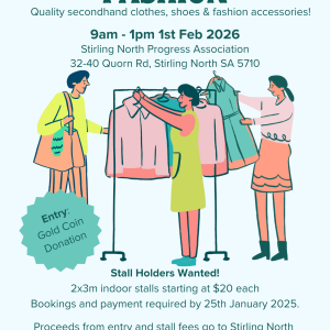 Affordable Fashion Quality, affordable pre-loved/secondhand clothes, shoes and accessories sale. All proceeds go towards a Defibrillator for Stirling North Progress Association. 01 Feb 9:00 am - 1:00 pm