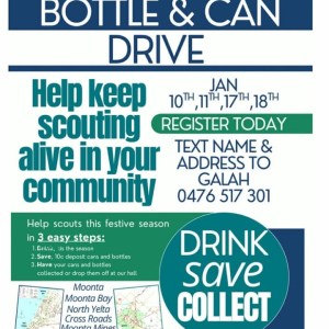 Moonta Scout Groups Can and Bottle Drive Help our Scout Group in a few easy steps! -Register to have us collect your cans and bottles on the... 18 - 26 Jan 8:00 am - 6:00 pm