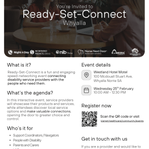 Ready-Set-Connect Whyalla What is it? Ready-Set-Connect is a free, fun and engaging speed-networking event connecting disability service providers with the people who... 25 Feb 10:00 am - 12:30 pm