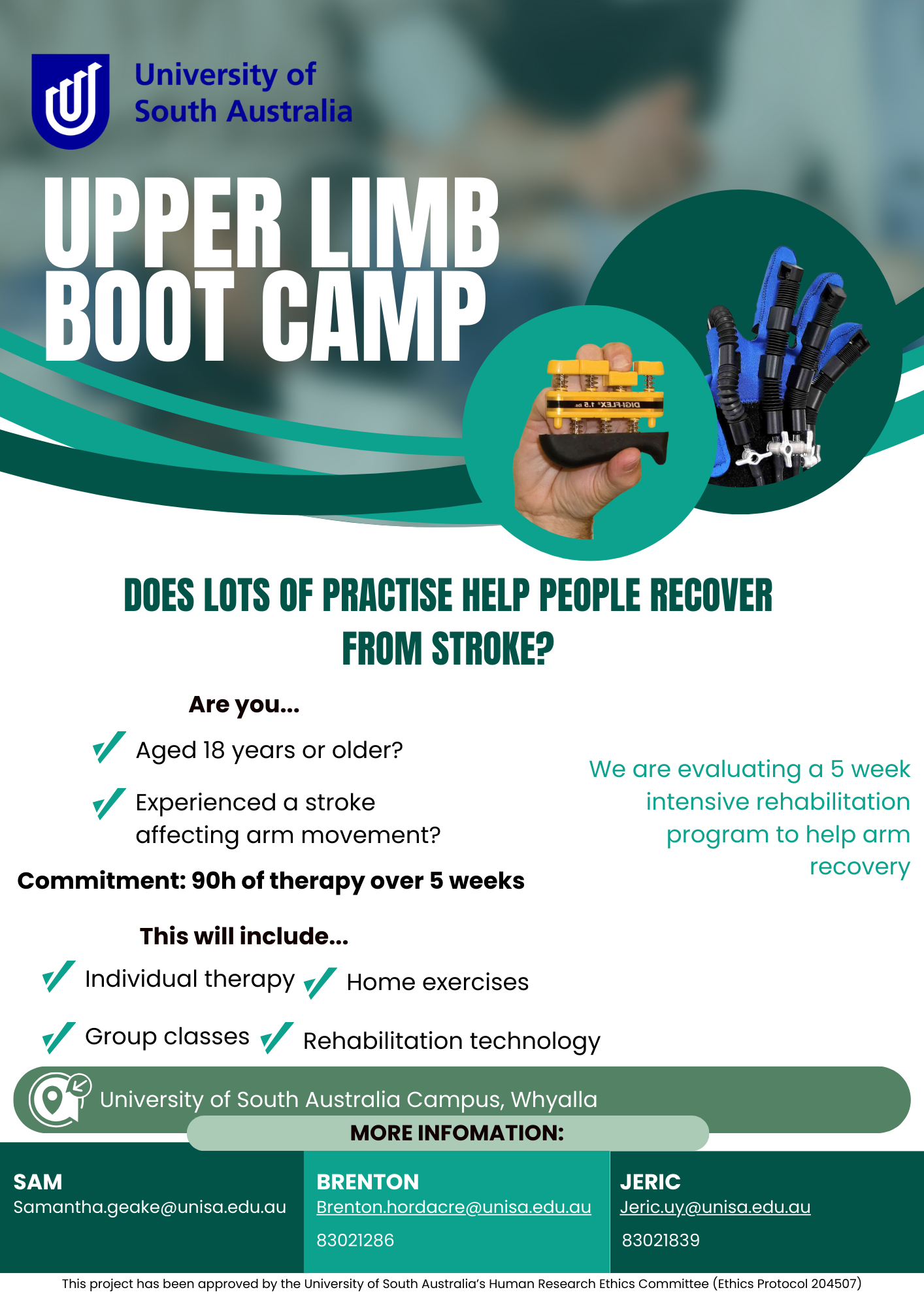 Opportunity for stroke survivors to participate in an intensive therapy program to help improve function in their arm.  The program runs for 5 weeks, 12 hours per week.  This program has been funded through the hospital research foundation, with the aim of determining if lots of practices helps people recover from stroke.